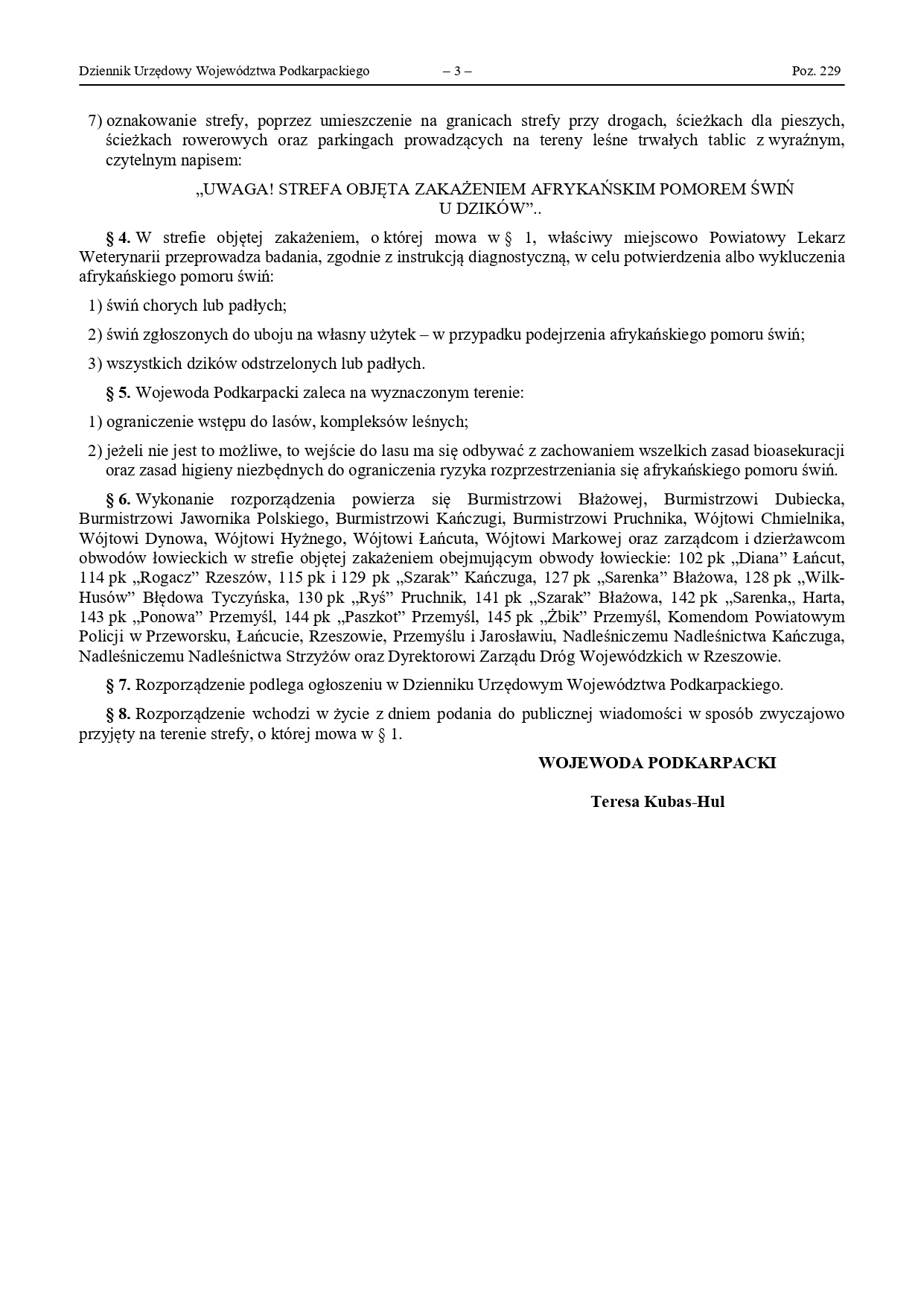 W związku z Rozporządzeniem Nr 2/2026 Wojewody Podkarpackiego z dnia 14 stycznia 2026 r. informujemy, że Gmina Hyżne została objęta strefą zakażenia ASF u dzików.