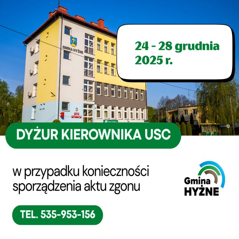 Szanowni Państwo, uprzejmie informujemy, że w związku z długą przerwą świąteczną w dniach 24–28 grudnia br. Kierownik Urzędu Stanu Cywilnego w Hyżnem pełni dyżur telefoniczny. Dyżur przeznaczony jest wyłącznie na wypadek konieczności sporządzenia aktu zgonu. 📞 Numer telefonu dyżurnego: 535 953 156 Prosimy o