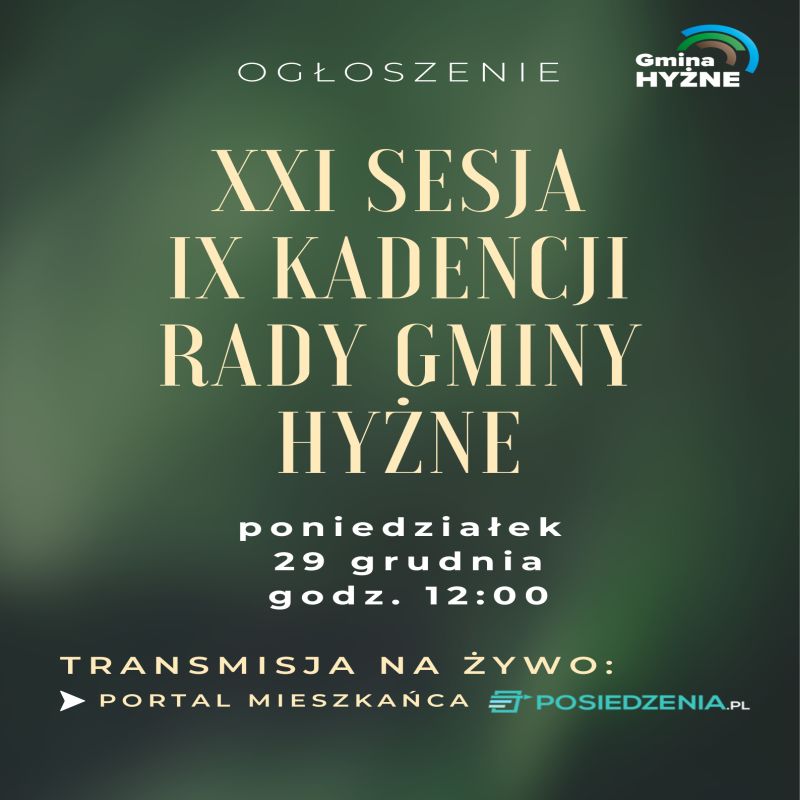 Przewodniczący Rady Gminy Hyżne informuje, że XXI sesja Rady Gminy Hyżne odbędzie się 29 grudnia 2025 r. o godz. 12:00 w sali konferencyjnej Urzędu Gminy Hyżne. Program sesji: Podjęcie uchwały w sprawie uchwalenia miejscowego planu zagospodarowania przestrzennego dla terenu zielonego wokół zalewu w miejscowości