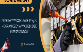 Uprzejmie informujemy, że w dniu jutrzejszym (piątek 10.04.2026 r.) w związku z pracami przy montażu agregatu prądotwórczego nastąpi planowane wyłączenie zasilania w części budynku Urzędu Gminy w Hyżnem. W czasie trwania prac w ciągu całego dnia wystąpią utrudnienia w funkcjonowaniu Urzędu, w szczególności ograniczony