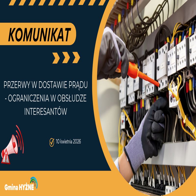 Uprzejmie informujemy, że w dniu jutrzejszym (piątek 10.04.2026 r.) w związku z pracami przy montażu agregatu prądotwórczego nastąpi planowane wyłączenie zasilania w części budynku Urzędu Gminy w Hyżnem. W czasie trwania prac w ciągu całego dnia wystąpią utrudnienia w funkcjonowaniu Urzędu, w szczególności ograniczony